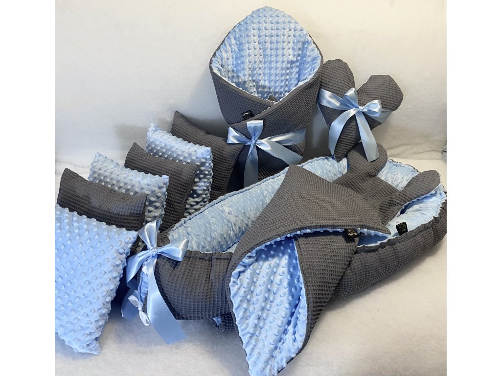 Set do postýlky tmavě šedá vafle - světle modrá minky - 6dílný